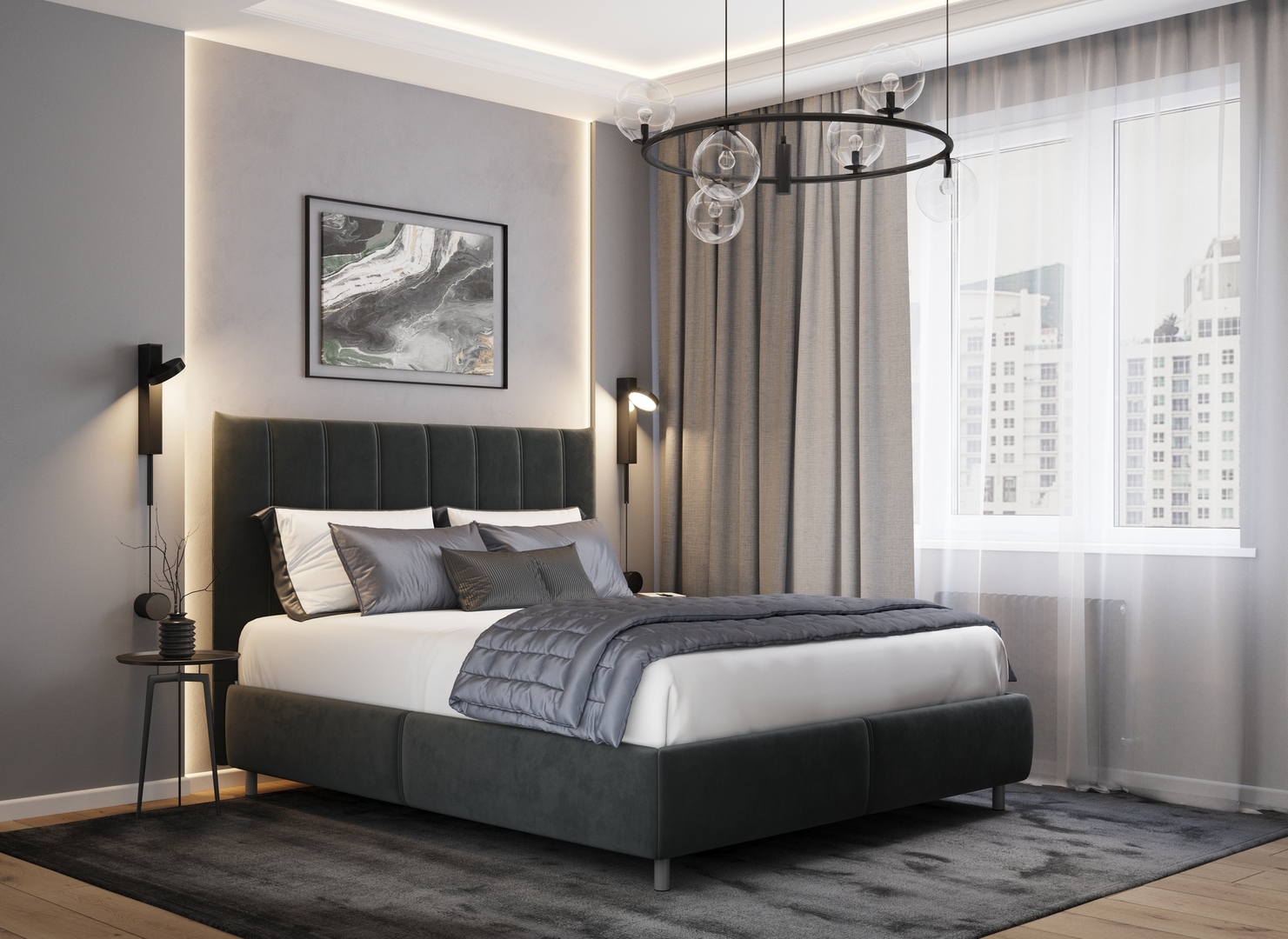 Обратная сторона изголовья выполнена в мебельной ткани и позволяет ставить кровать в центре комнаты для зонирования пространства.