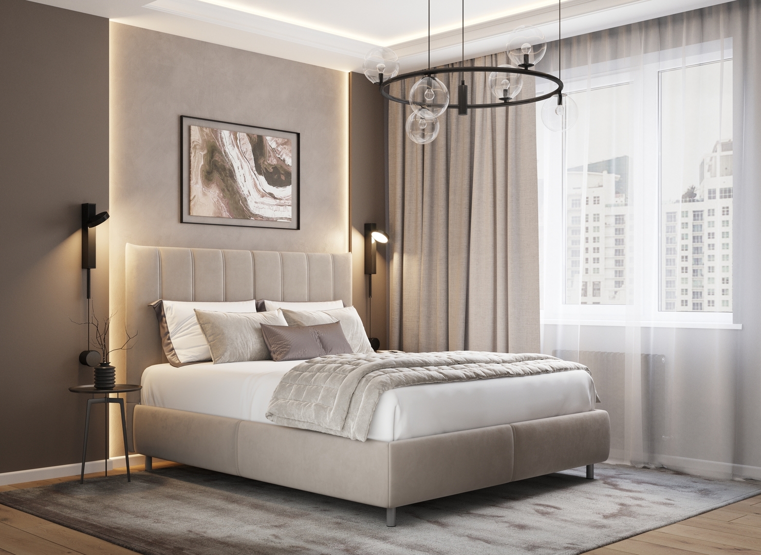 Творчески завершить образ спальни помогут дополнительные аксессуары: декоративные подушки и тумбы.