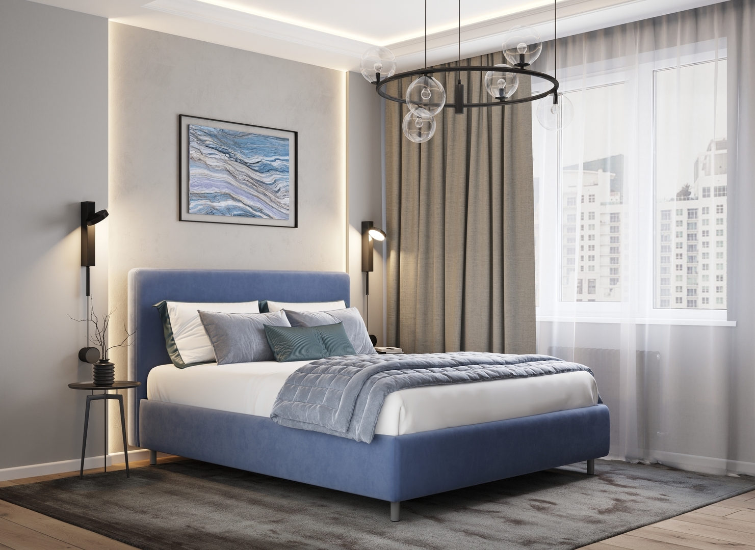Творческий подход к выбору обивочного материала меняет образ дизайна. Велюр за счет своей бархатистой фактуры привносит в пространство шика и утонченности. Шенилл дополняет оформление спальни природными текстурами, создавая атмосферу тепла и уюта.